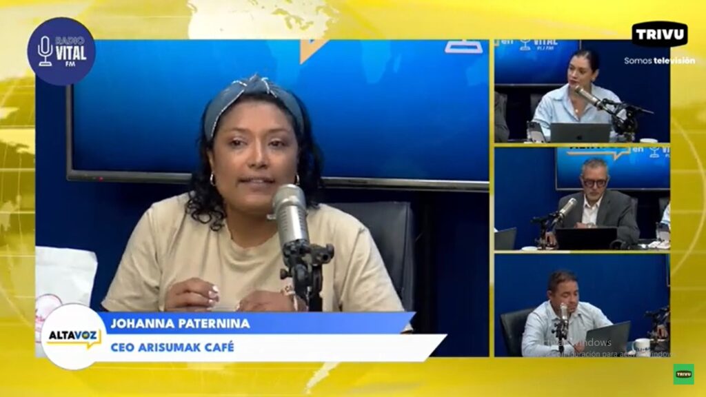 RADIO VITAL FM. Entrevista a Johana Paternina propietaria de la cafetería Arisumak Café, martes 4 de febrero de 2025. Programa: Alta Voz en vivo. Conduce Rumi Cevallos, Aaron Salomon. Duración: 15 minutos. Horario 8.30 am.